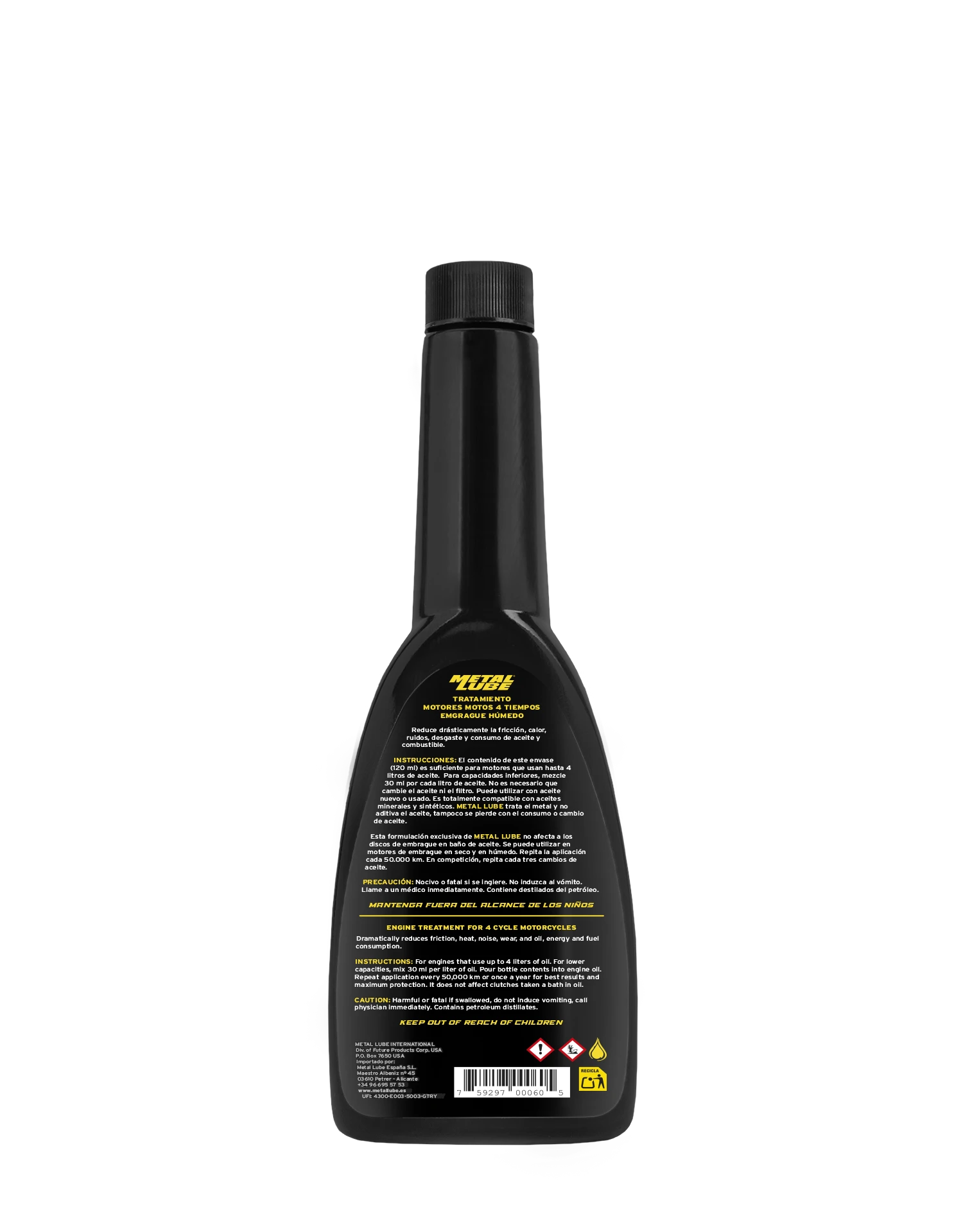 Formulado específicamente para motocicletas, donde el aceite debe soportar condiciones más exigentes que en un automóvil. METAL LUBE crea una barrera protectora entre las superficies metálicas, reduciendo la fricción y el calor generado por la alta presión entre los componentes del motor, los engranajes y el embrague. Previene el patinaje de discos, favorece una entrega de potencia más eficaz y protege frente al desgaste, vibraciones, ruido y consumo excesivo de aceite o combustible.