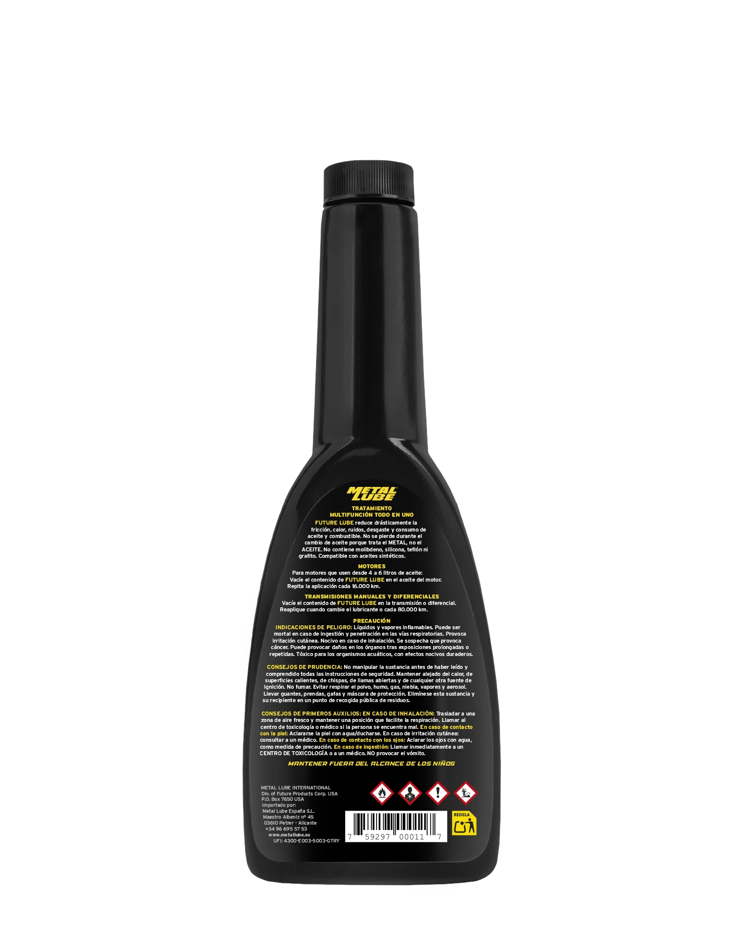 Future Lube actúa sobre las superficies metálicas formando una capa protectora que reduce la fricción interna, disminuye la temperatura del aceite y amortigua los ruidos por rozamiento. Esta mejora en la lubricación se traduce en menor consumo de aceite y combustible, protección efectiva durante los arranques en frío y una mayor durabilidad del motor o sistema tratado. Su fórmula permanece activa incluso tras los cambios de aceite, degradándose únicamente por uso y revoluciones.