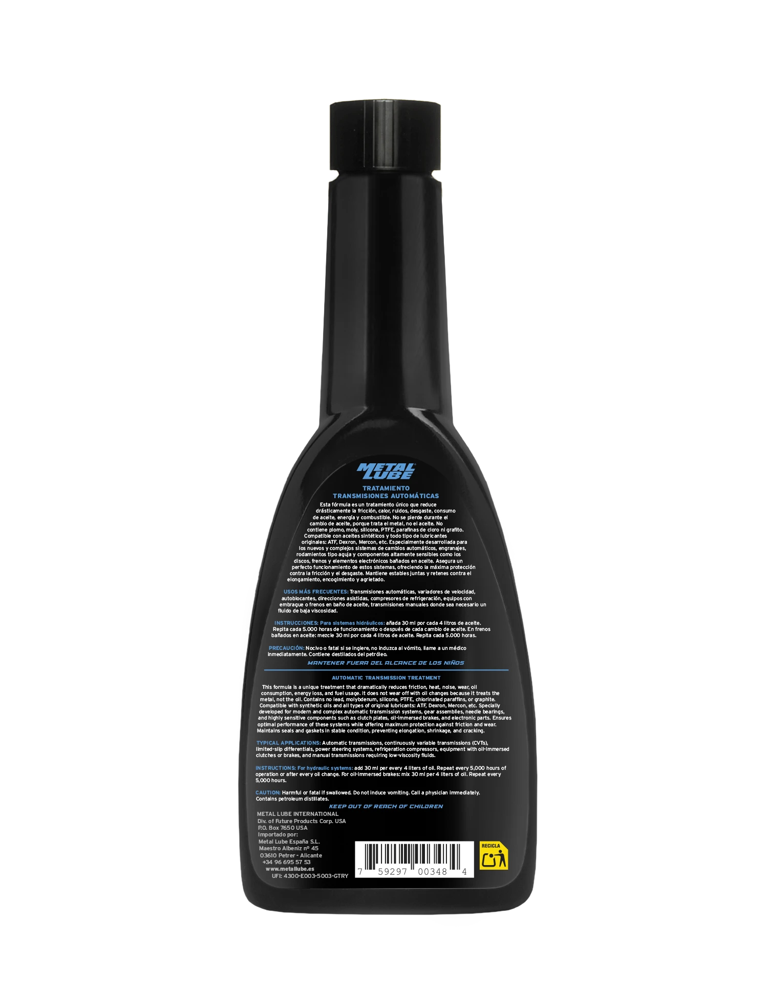 Añadir 30 ml de METAL LUBE por cada litro de aceite directamente en el sistema (transmisión, dirección asistida, compresor, etc.).